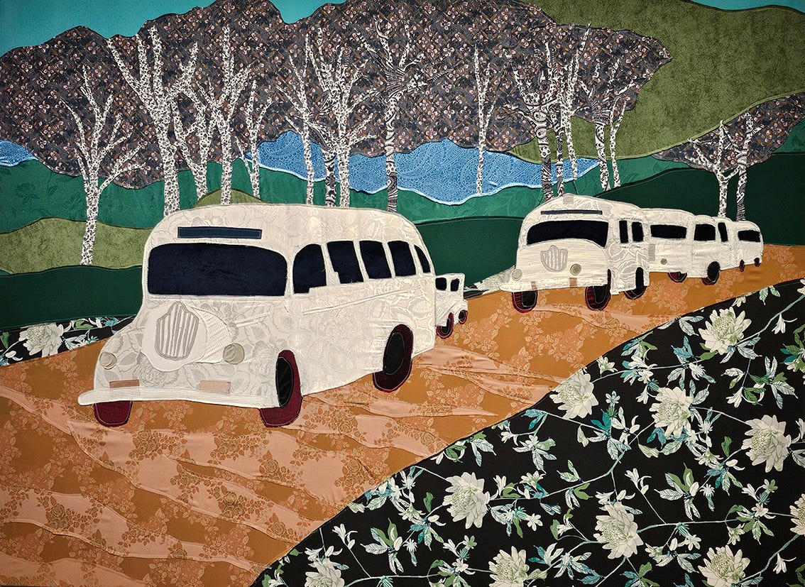 The picture above, The White Buses, is a large textile collage by the Polish-Romani artist Malgorzata Mirga-Tas. (On display at Väsertås Museum, in Sweden)